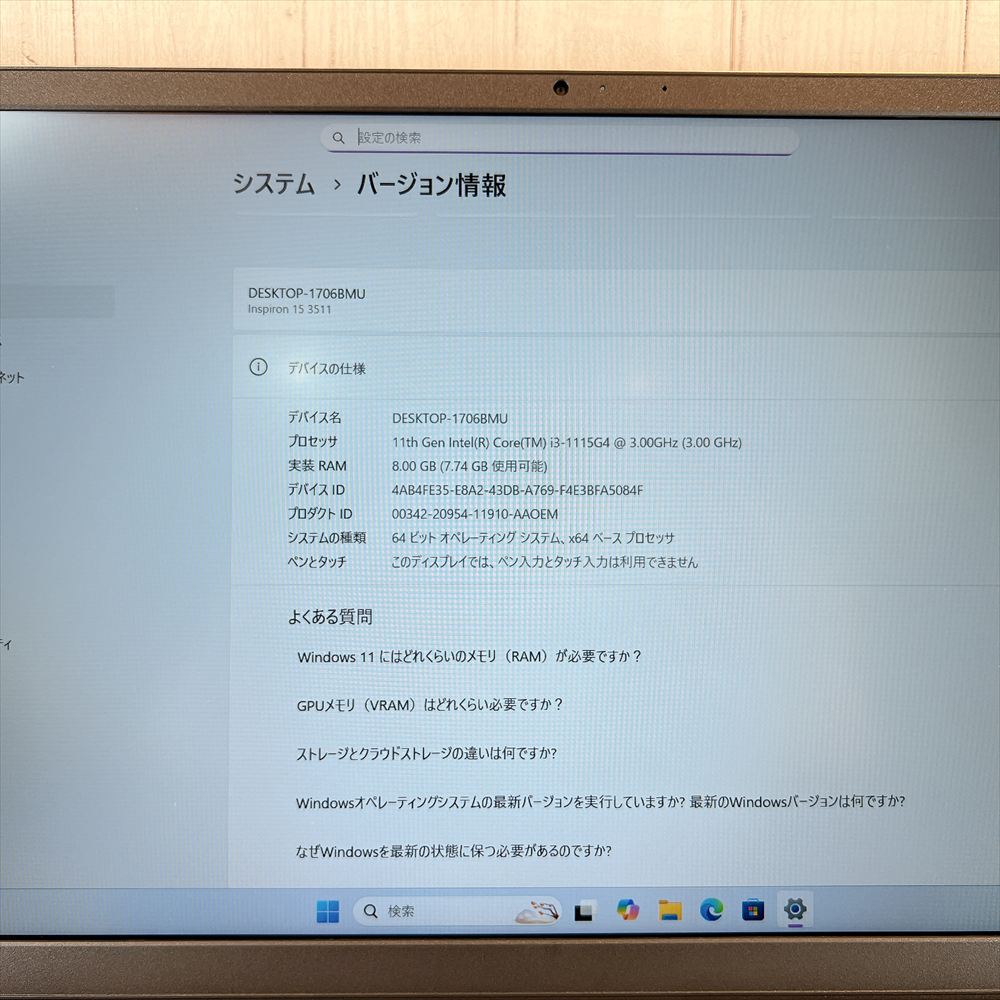 【美品】DELL Inspiron15 3511 / 2022年10月製 / Core i3-1115G4 / メモリ8GB / 新品SSD240GB / Windows11 25H2 / LibreOffice / 15.6型 HN-2012